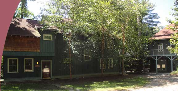 Retreat House (left) is connected to the Sanctuary via outdoor walkways on both levels. The Retreat House has 15 rooms — 2 floors with 7 single occupancy rooms on each floor. Each room has a sink and mirror, a glider rocking chair, a desk with chair and a twin bed. On each floor there are 2 private toilet rooms and 2 private shower rooms. The upper floor has 1 queen room with private bathroom. Towels, linens and soaps are provided for each room. There is a large common room with comfortable seating on the ground floor. The retreat house and Sanctuary have high speed wireless internet access. |